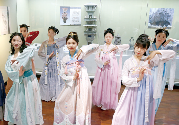 ▲汉服爱好者表演“绿铀陶楼”藏品上的场景