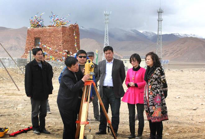 沈阳德源集团董事长崔玉晶(右一)、定日县委常委、宣传部长何贤江(左一),县委宣传部沈洁(右二)、沈阳春辰新型建筑材料制造有限公司董事长李春福(右三)等在定日县岗嘎山头实地测量