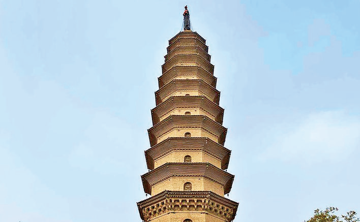 该塔坐北朝南,塔身向上逐层收分,每层均叠涩出檐,每面宽3米,始建于北宋熙宁八年(1075年)。 塔身底层较高,第一至第三层檐下用砖雕刻出仿木构斗栱,下施砖普柏枋,转角铺作与补间铺作均五铺作出双杪;4层以上各层为砖叠涩檐。塔内中空,底层内因空间高隔为两层,共计11层楼板。塔刹刹柱折断,残存覆钵,上有“大宋熙宁八季三月二十八日铸造……”铭文。此外,塔内壁现存小佛像、佛龛、壁画以及元、明各代题记。