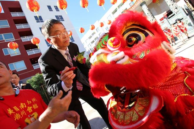 在洛杉矶潮州会馆关帝庙前,郭小青会长亲手为雄狮点睛