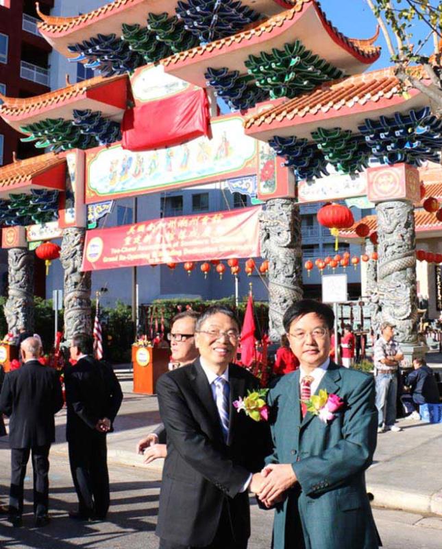 郭小青会长与关公文化学者朱正明在洛杉矶关帝庙前